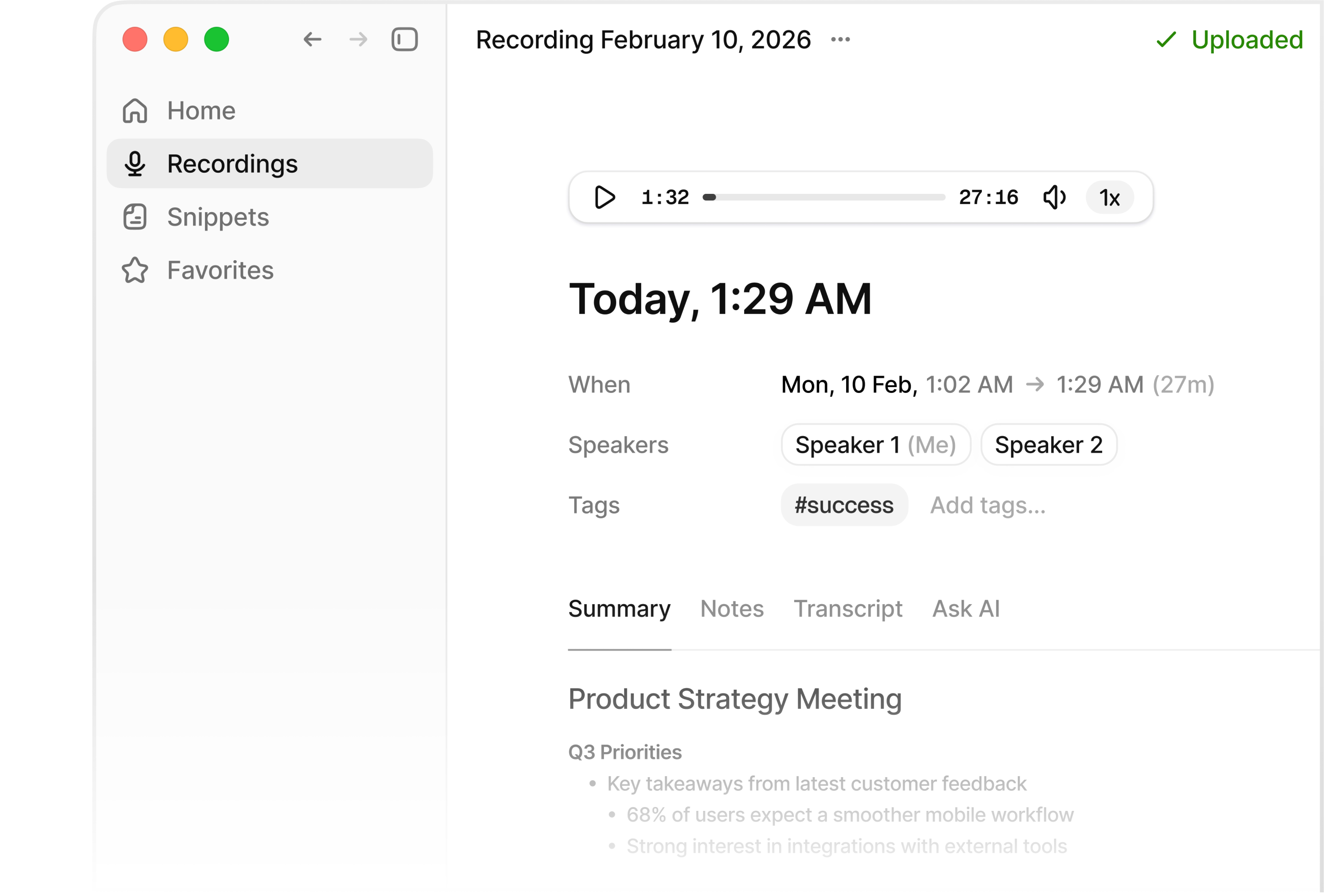 Use our local recorder for a no-bot experience. Great for in-person meetings or no-bot calls.