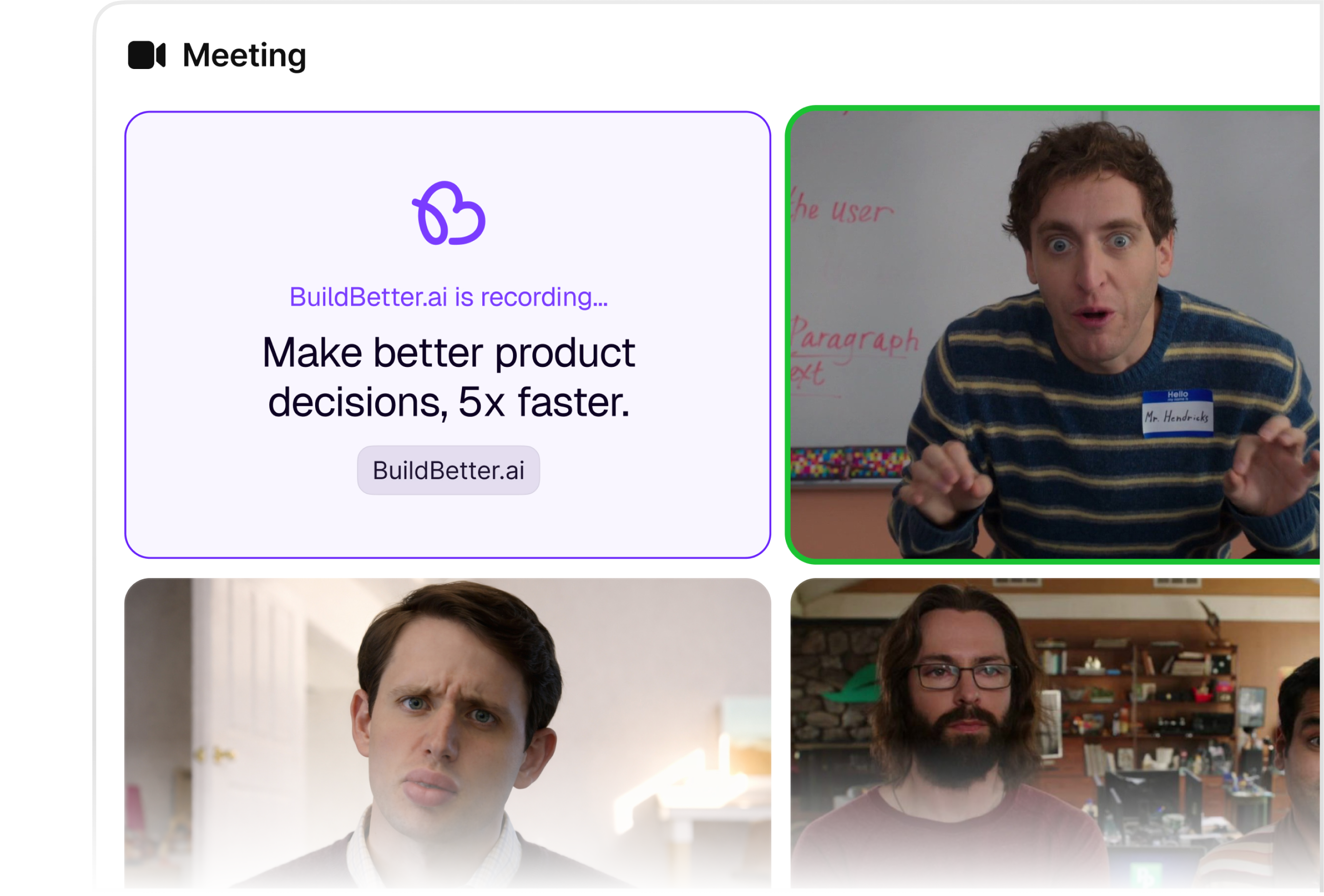 Import from your existing recording stack, or record locally with BuildBetter Recorder. Use a bot when you want automation and control, and use no-bot when you need privacy.